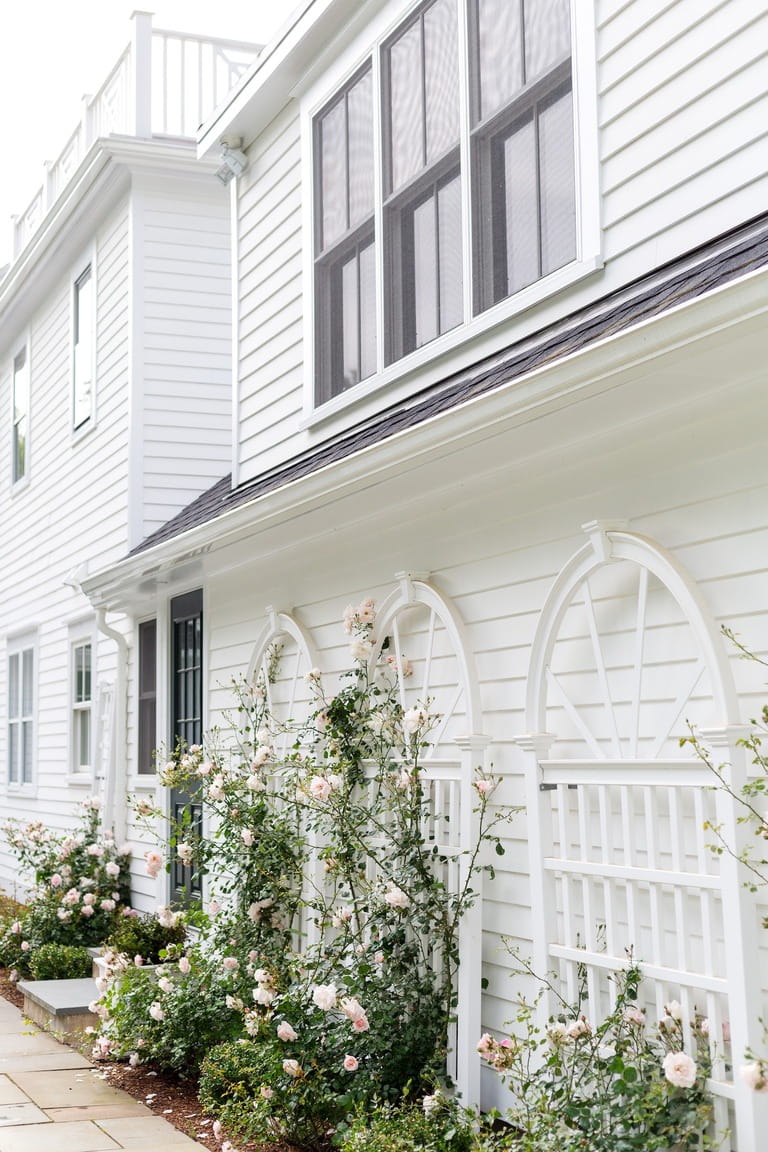 This trellis design is a perfect example of how a simple and elegant structure can enhance a garden's beauty while providing essential support for climbing plants. The combination of the arched shape, white color, and lattice structure creates a timeless and charming look that complements the traditional style of the house.